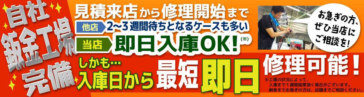 店舗にてお客様のお車をお預かりし、バンパー・ドア・フェンダー・ルーフ・ボンネット・バックドア等の車傷の修理を自社工場にて行います。
