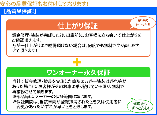 また、当社が修理させて頂いた部分は仕上がり・ワンオーナー永久保証させて頂きます。